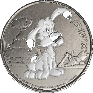 La mini-médaille, couleur argent, représente Idéfix le personnage préféré des français parmi les membres du village gaulois d'Armorique. Idéfix ressort par une colorisation : le pelage de couleur blanche, oreilles, la truffe et la queue sont colorisés en noir. En fond on aperçoit les maisons du village gaulois.