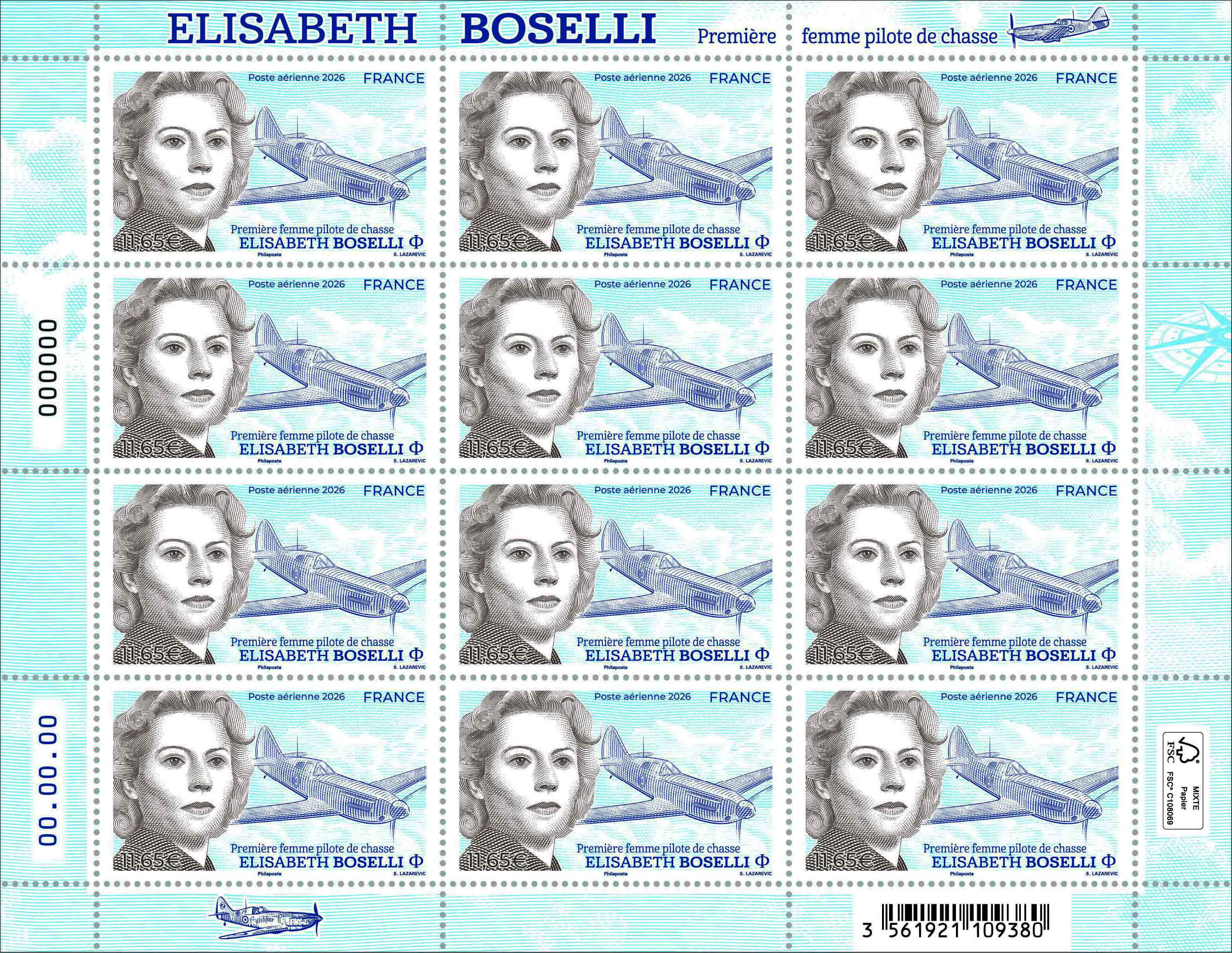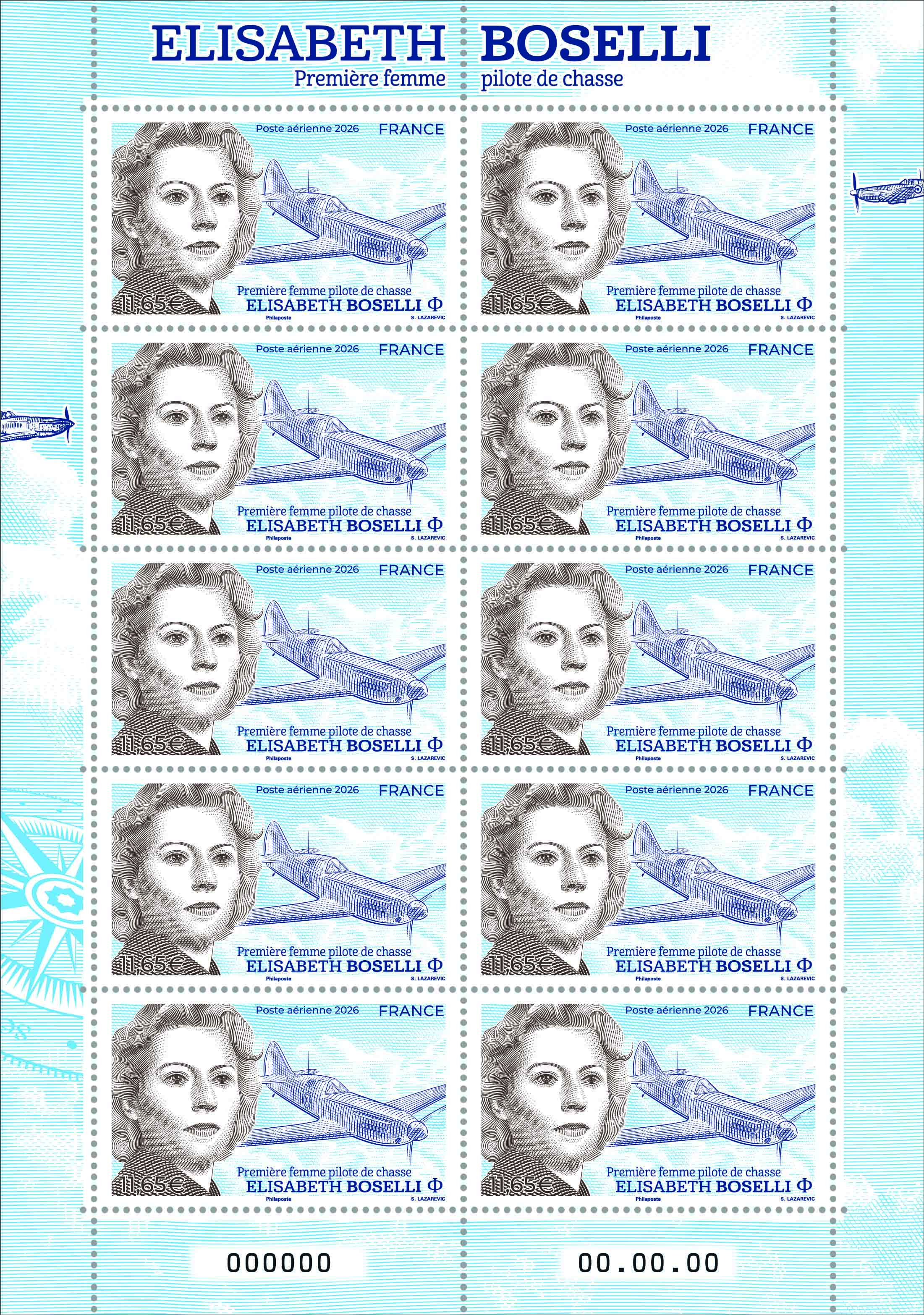 La Poste émet un timbre et une mini-feuille de la série Poste aérienne à l’effigie d’Elisabeth BOSELLI, première femme brevetée pilote de chasse et détentrice de plusieurs records du monde sur Mistral.